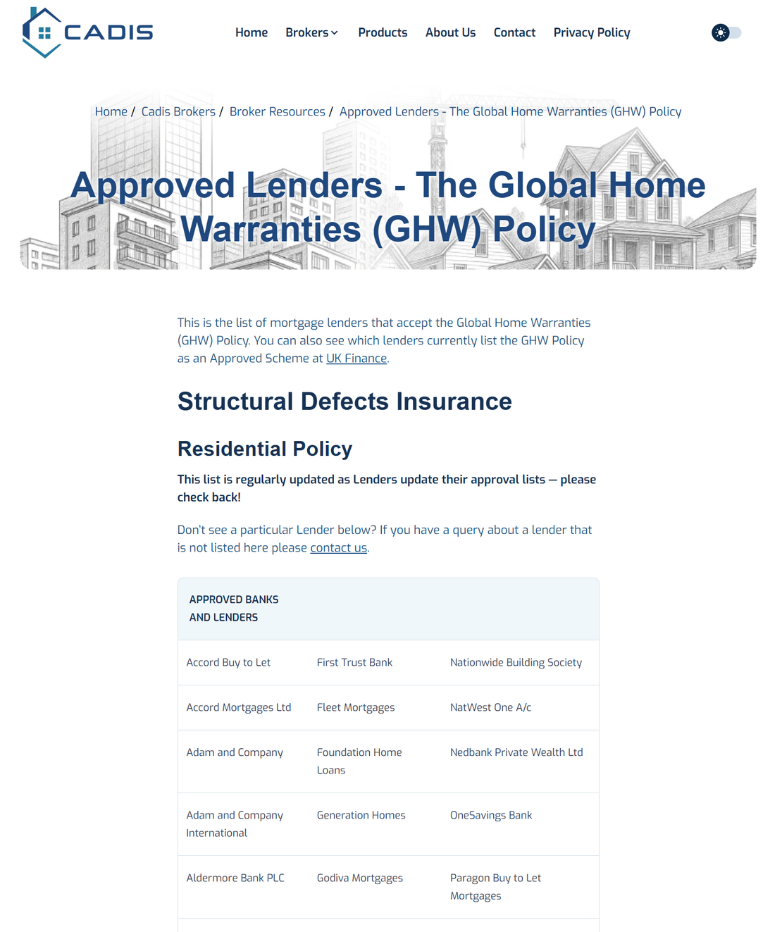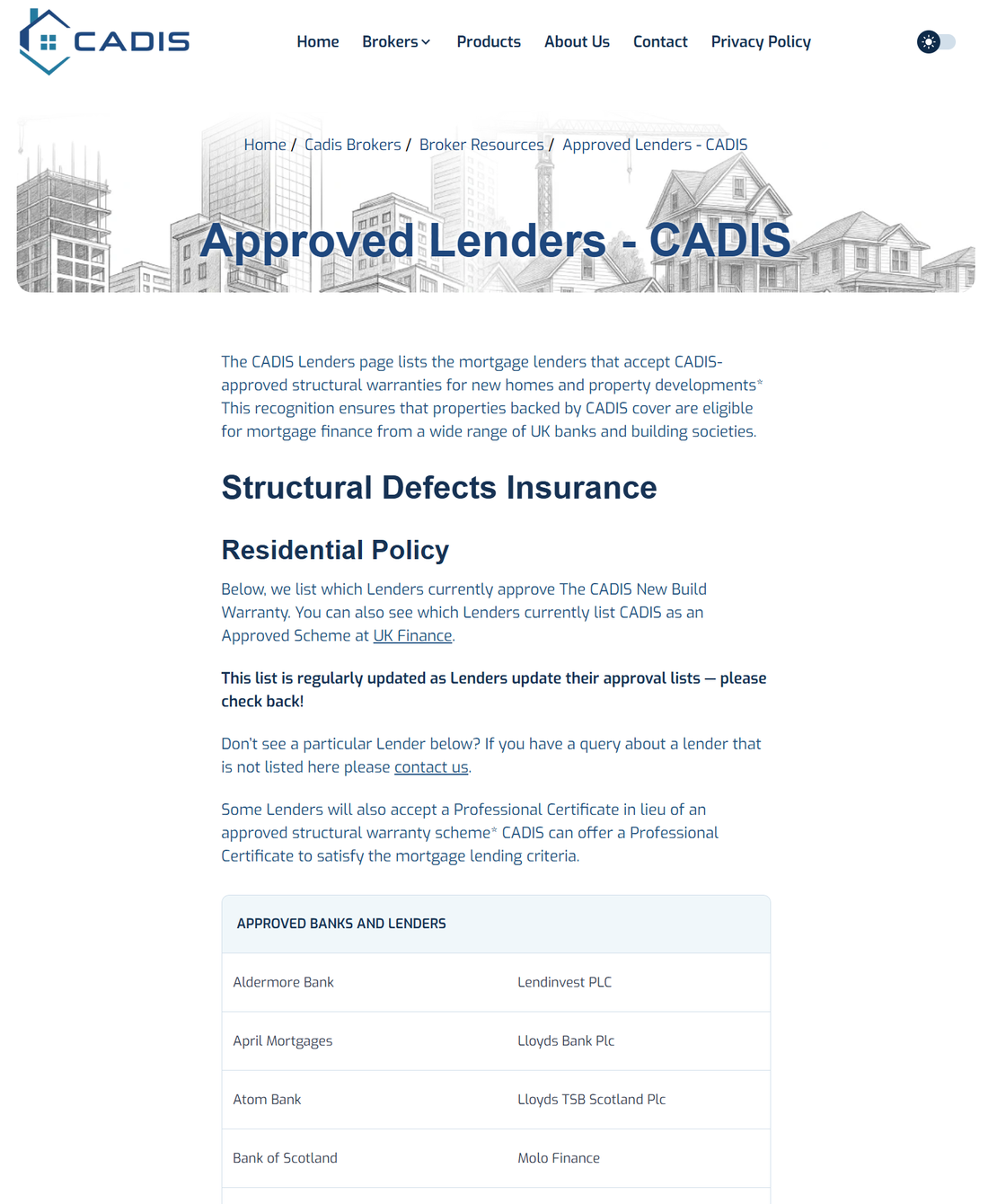 The CADIS Lenders page lists the mortgage lenders that accept CADIS-approved structural warranties for new homes and property developments* This recognition ensures that properties backed by CADIS cover are eligible for mortgage finance from a wide range of UK banks and building societies.